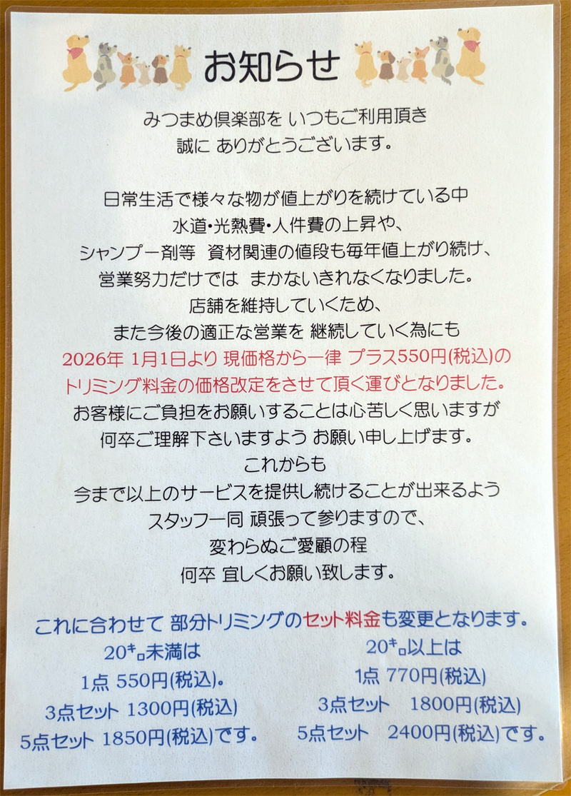 2026年1月1日より現価格から一律プラス550円(税込)のトリミング料金の価格改定をさせて頂く運びとなりました。
